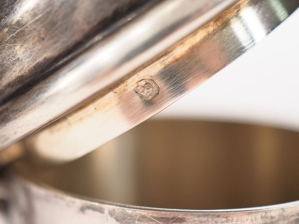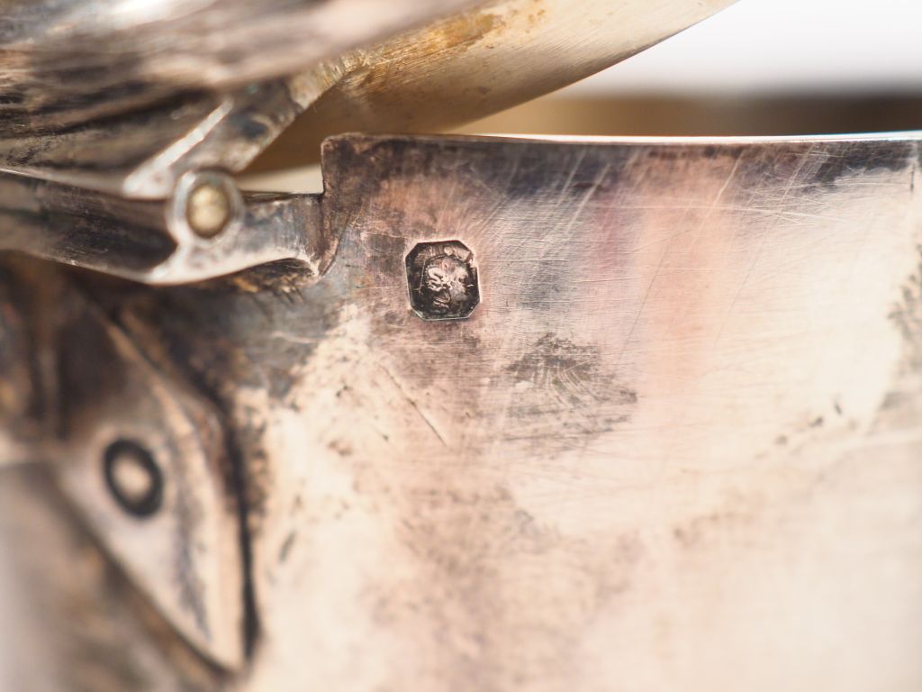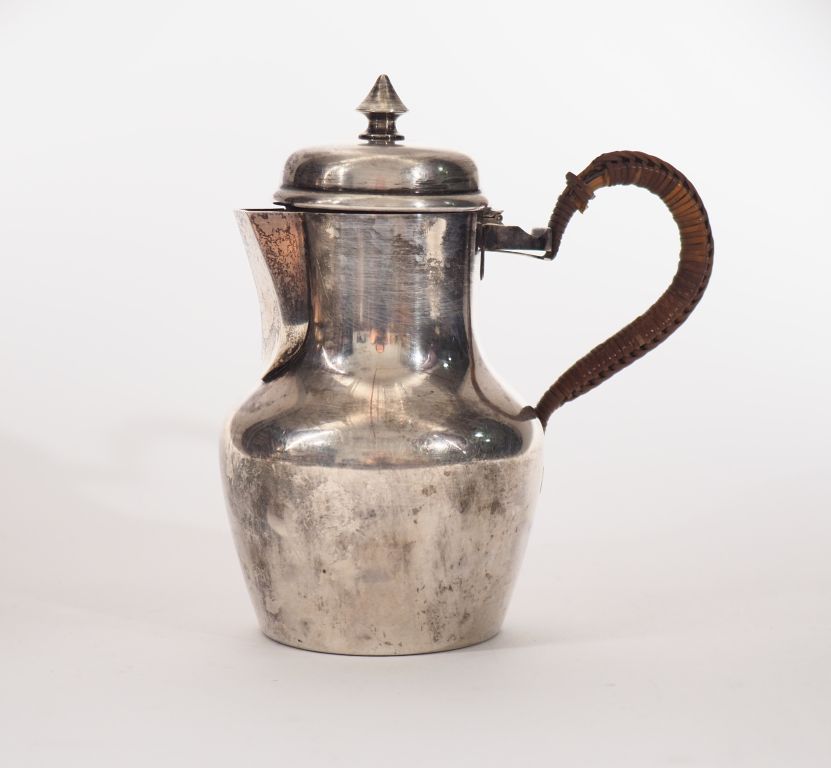 Petite verseuse égoïste en argent lisse, poinçon Minerve. Prise du couvercle en forme de toupie. Anse, gainée d'osier. H. 16 cm Poids tel. 314 g