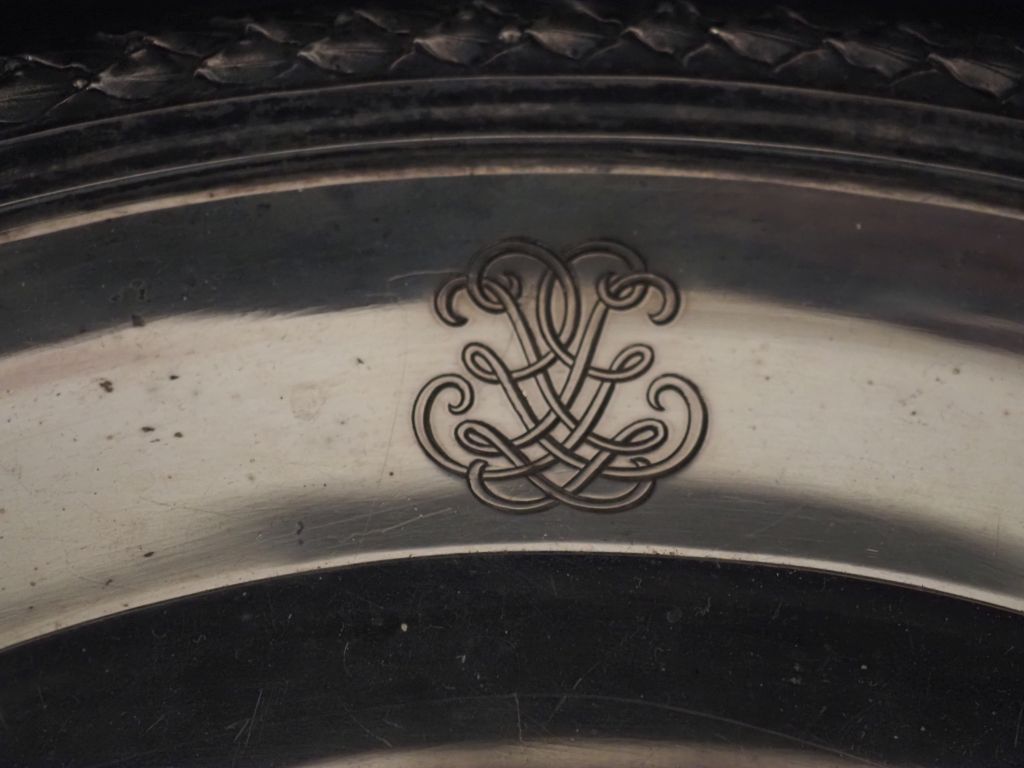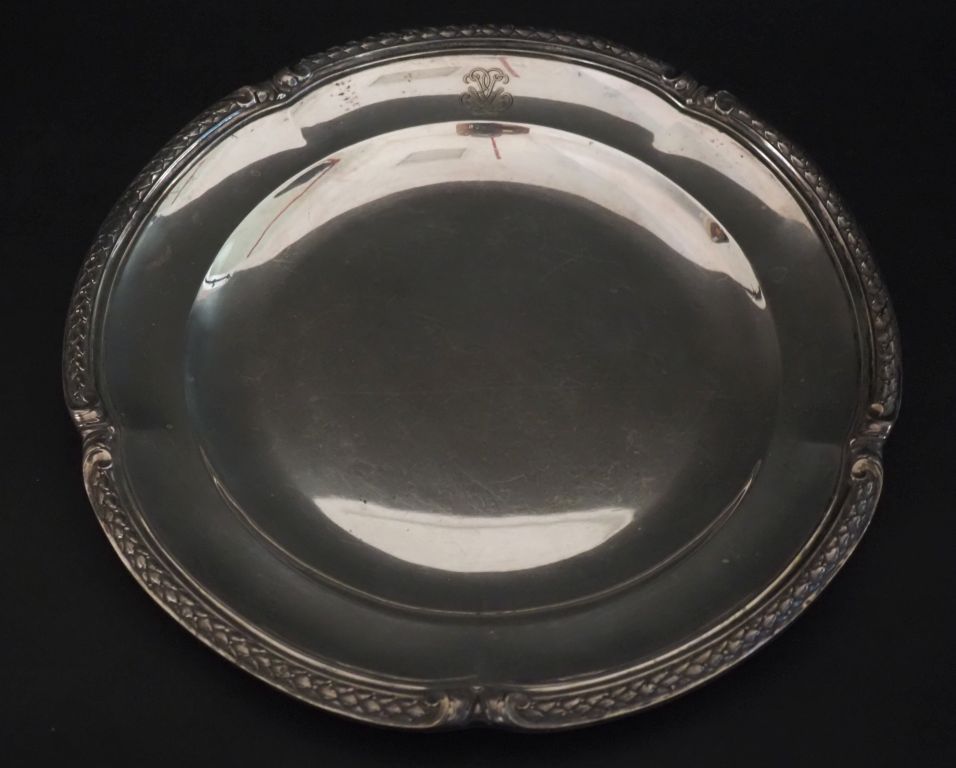 Plat à bord polylobé en argent 925, poinçon Minerve, à décor d'une frise de feuilles de laurier et d'enroulements. Monogrammé. M.O : A. Aucoc Diam. 32,5 cm Poids. 1300 g