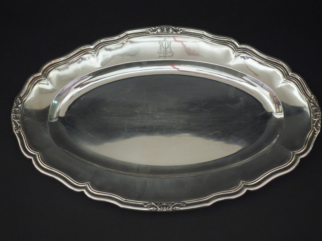 Plat ovale de style Louis XV en argent, poinçon Minerve, modèle à filets, à décor de coquilles et rinceaux feuillagés. Bord polylobé. Monogrammé. 42,3 x 27 cm Poids. 960 g
