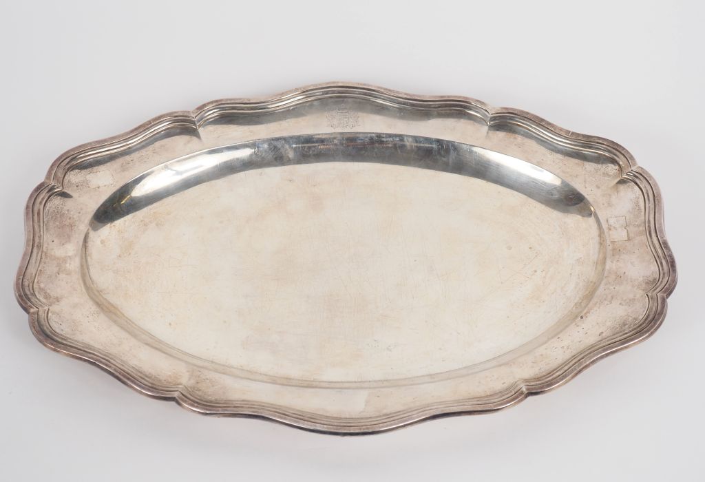 Plat ovale en argent de style Louis XV, poinçon cygne, modèle à filets. Bord chantourné. Armorié. M.O : Proll 30 x 44 cm Poids. 1302 g