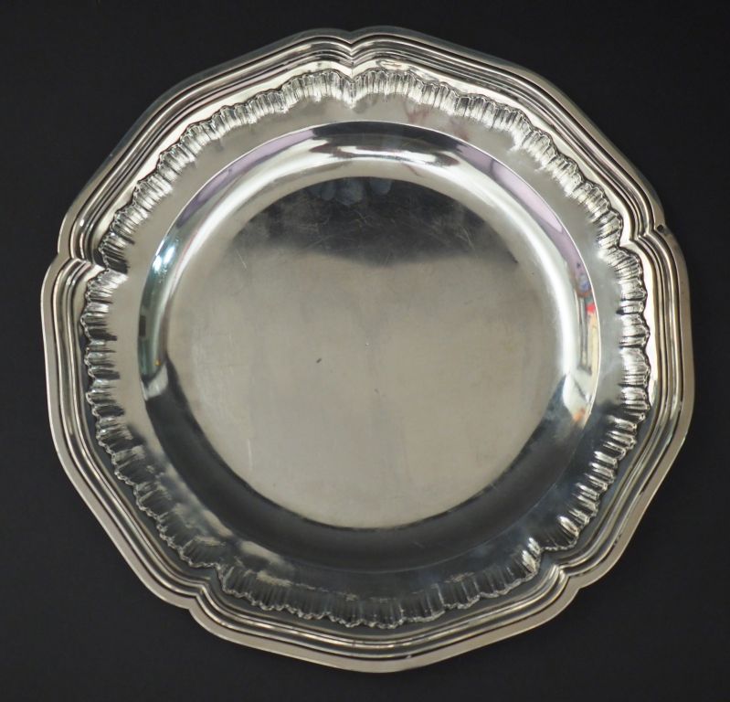Plat rond de style Louis XV en argent, poinçon Minerve, modèle à filets, décor peigné. Bord polylobé. M.O : G. Bachelet à Paris. Diam. 27 cm Poids. 569 g