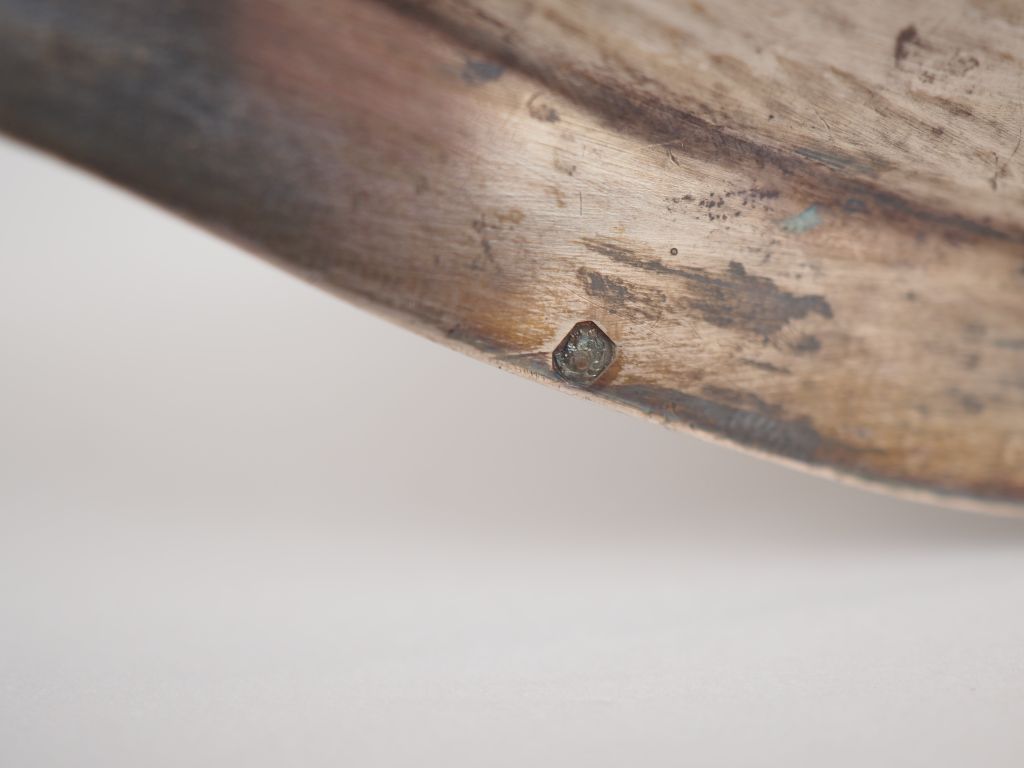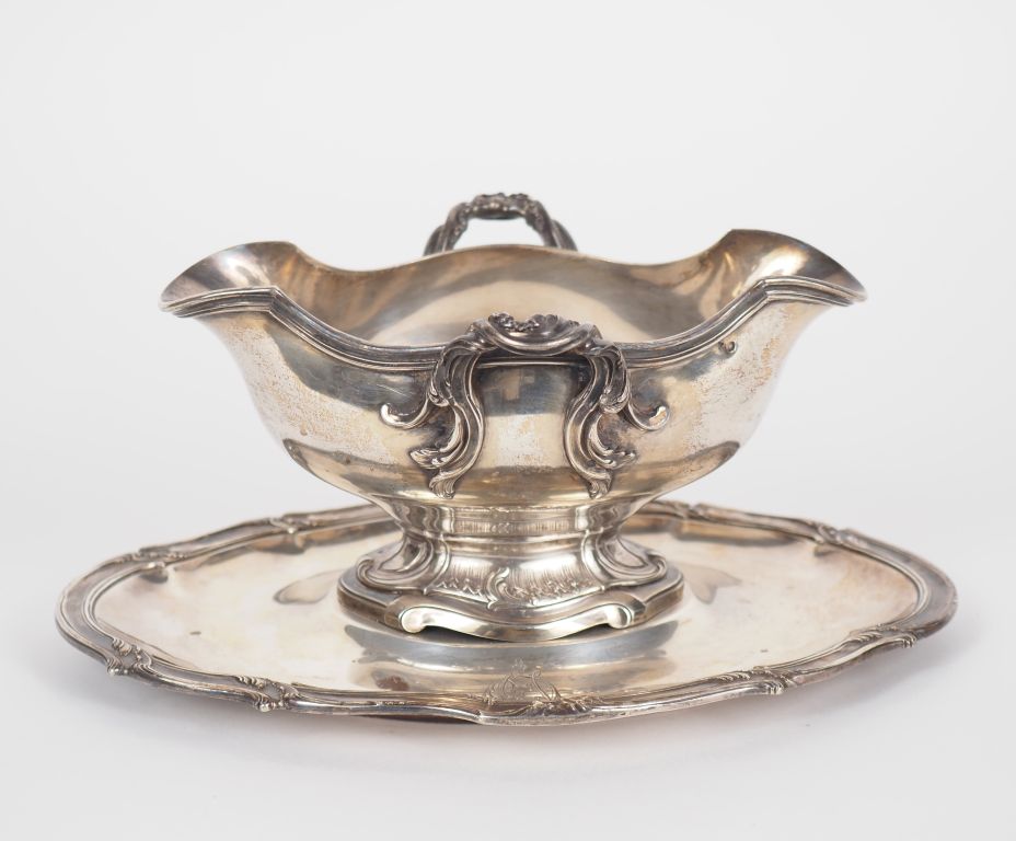 Ravissante saucière de style Louis XV en argent 925, poinçon Minerve, à décor de rinceaux, rocailles, enroulements et motifs peignés. Attaches des anses feuillagées. Monogrammée sur le plateau. M.O : H Cie 11,5 x 25,5 x 17 cm Poids. 747 g