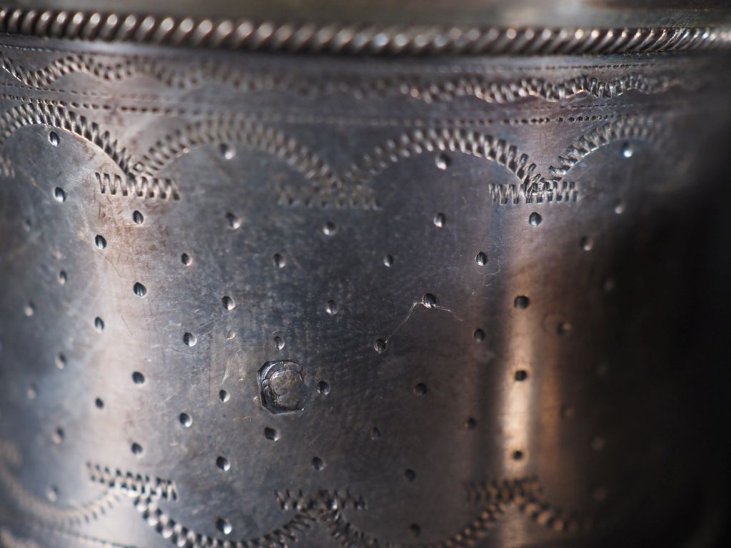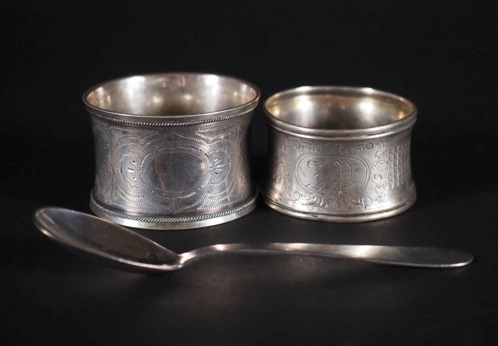 Rond de serviette en argent 925 de style Louis XVI à décor de motifs géométriques. Poinçon Minerve. Poids. 30 g. On y joint un rond de serviette en argent 900. Poinçonné. Poids. 10 g. (état moyen). On y joint une petite cuillère en argent 925 modèle uniplat. Poinçon minerve. Poids. 18 g.