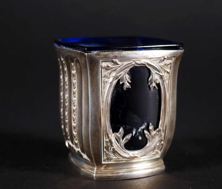 Saleron en argent poinçon Minerve, côtés ajourés, fond plat, verrine bleue, M.O Risler et Carré, Poids : 60 g