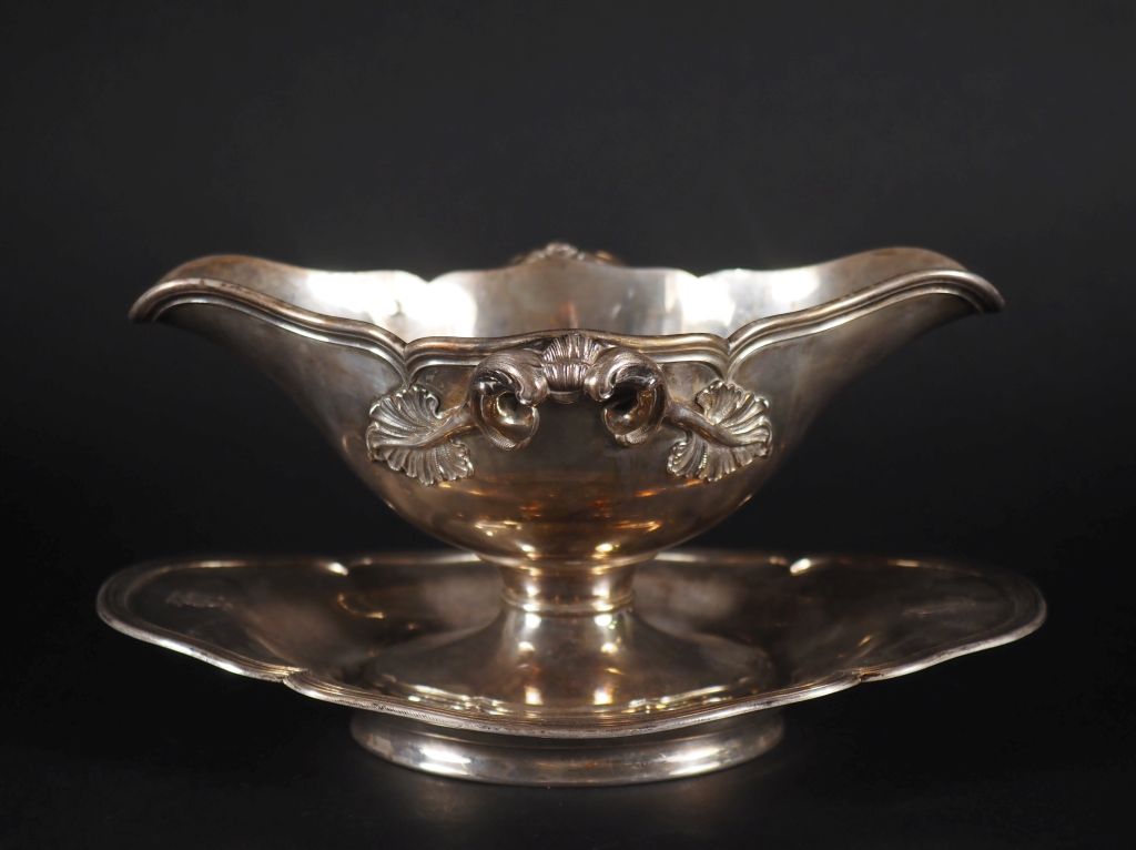 Saucière sur son plateau en argent 925 de style Louis XV à décor feuillagée et ornée d'initiales. Poinçon Minerve. Poids. 799 g.
