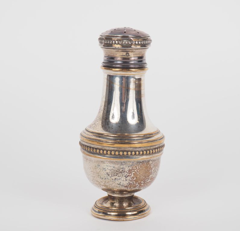 Saupoudroir en argent 925 et métal argenté, à décor de rangs de perles. Partie supérieure en argent et partie inférieure en métal argenté. H. 16 cm Poids tel. 95 g Poids de la partie en argent : 11 g (petits enfoncements, usures)