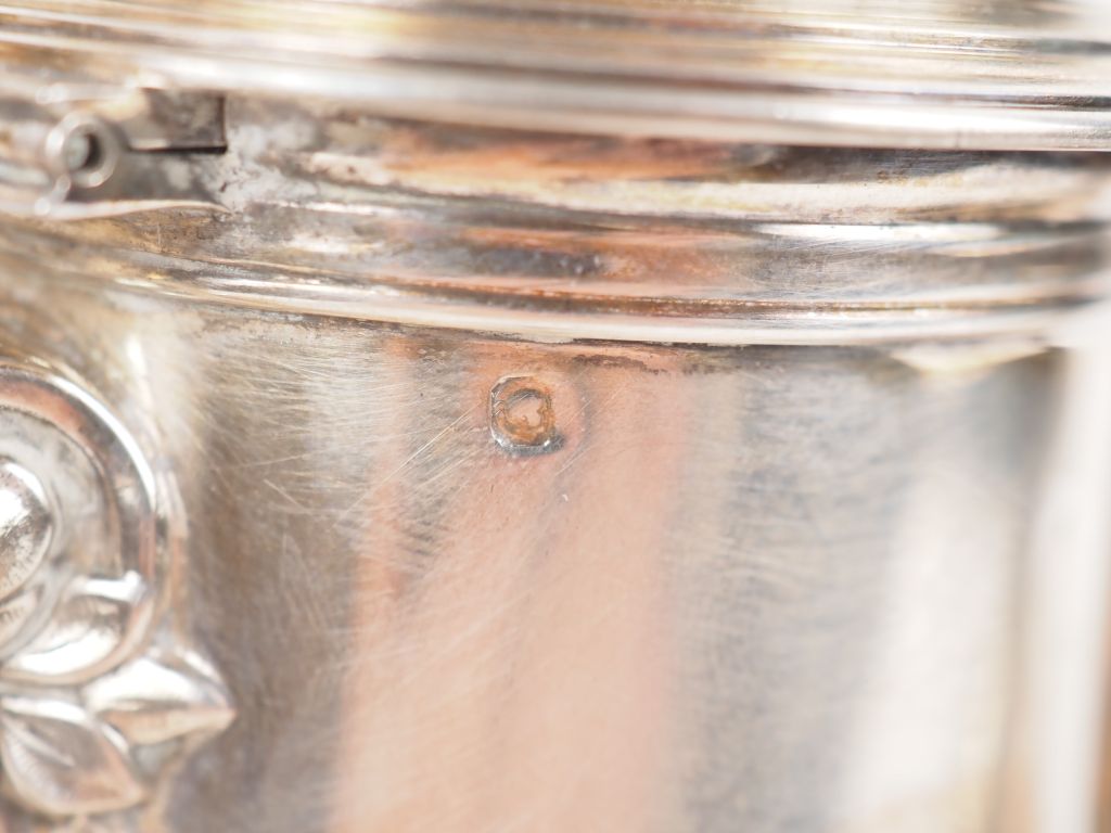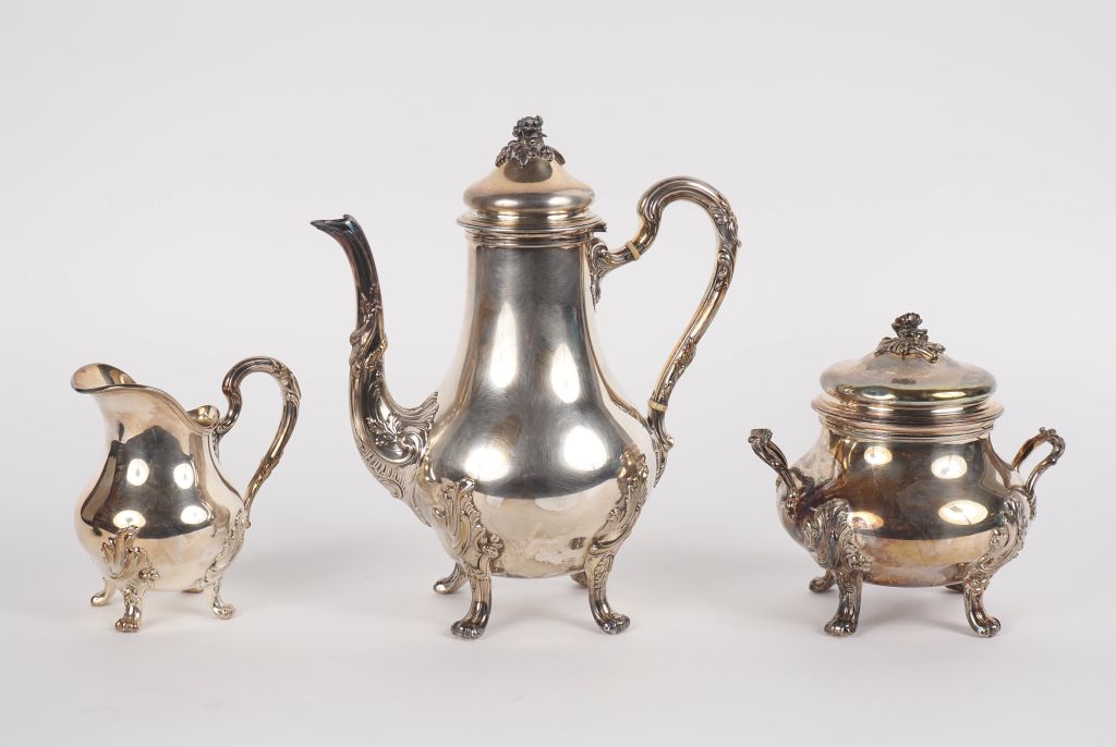 Service à café, trois pièces, Napoléon III de style Louis XV à décor de feuillage et de fleurs en argent 925 Poinçon Minerve Poids : 1433 g
