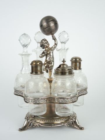 Service à condiments Napoléon III en cristal gravé et argent, poinçon Minerve, à décor d’amour portant un globe. H. 28,5 cm