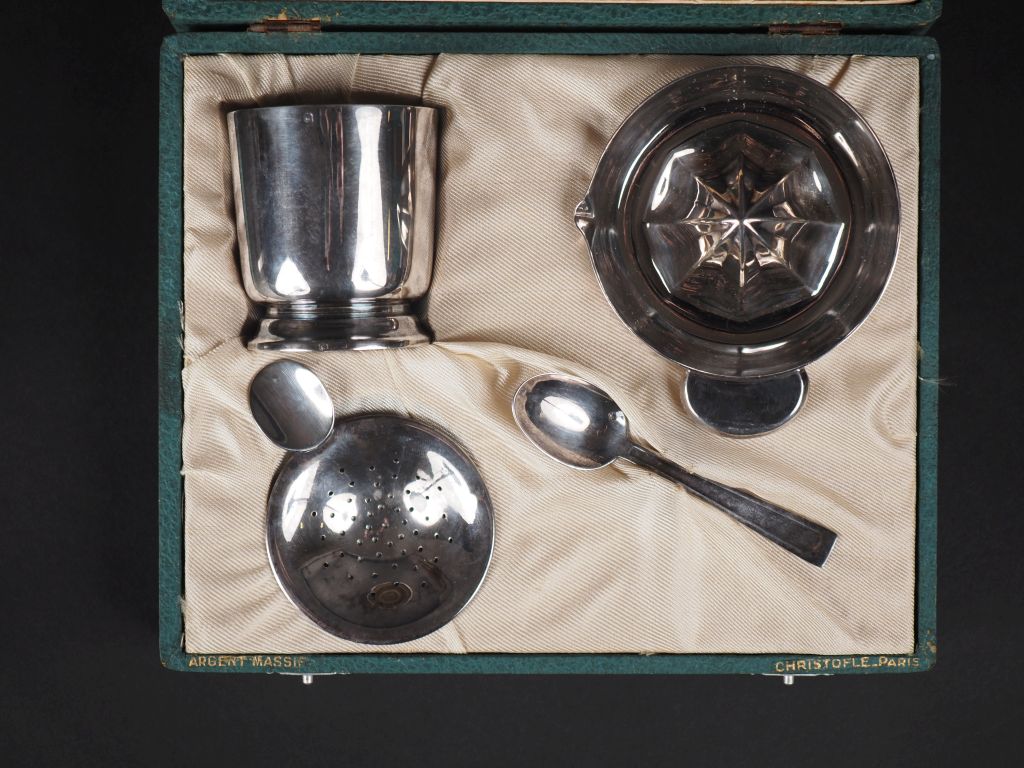 Service à jus d'orange en argent, poinçon Minerve comprenant: une timbale un presse citron une passette une petite cuillère Poids total : 224 g MO : Christofle dans son écrin d'origine