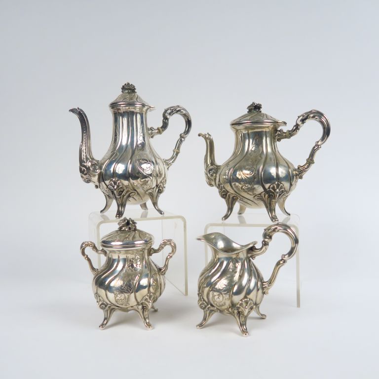 Service à thé et à café de style Louis XV quatre pièces en argent, 800 millièmes, à décor de cotes torses et de rinceaux feuillagés comprenant : une théière, une cafetière, un pot à lait et un sucrier. Poids. 1340 g