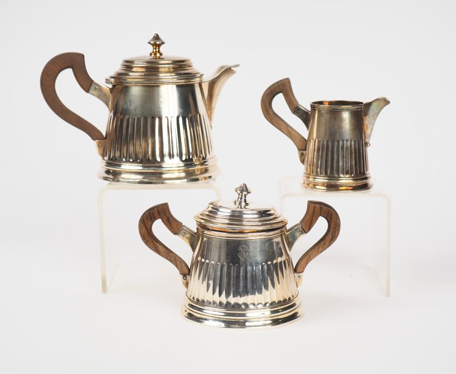 Service égoïste en argent, poinçon Minerve, à décor de cannelures. Comprenant : - une théière H. 12,5 cm - un sucrier H. 10,5 cm (couvercle légèrement voilé) - un pot à lait H. 8,7 cm Anses en palissandre. Monogrammé. Poids tel : 709 g (monogramme légèrement effacé)