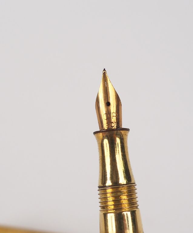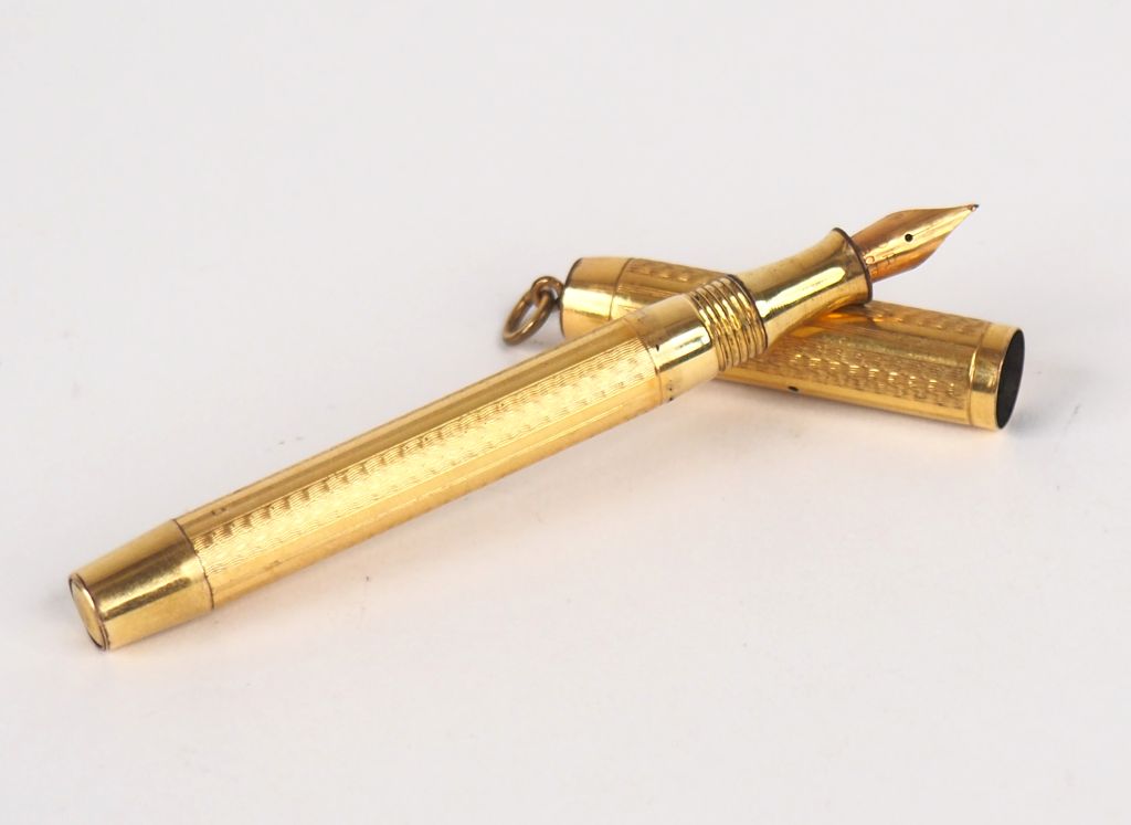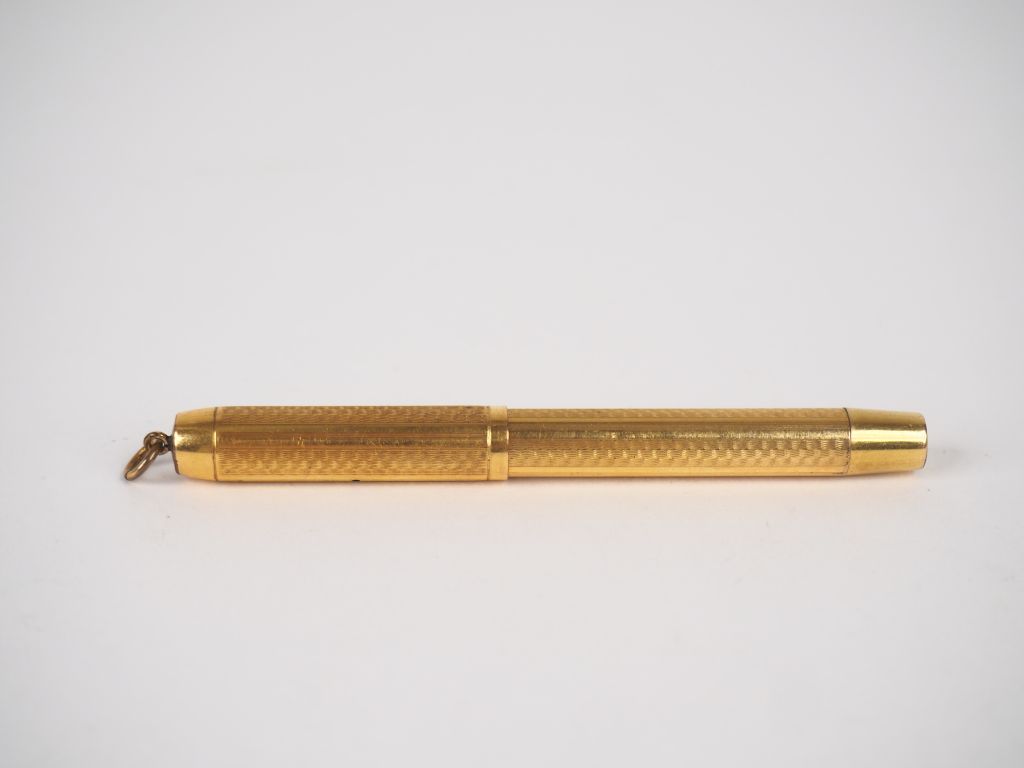 Stylo plume en métal doré et or. Poids tel. 11,7 g. L. 9 cm.