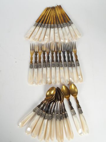 Suite de couverts à dessert en métal doré et manche en nacre.