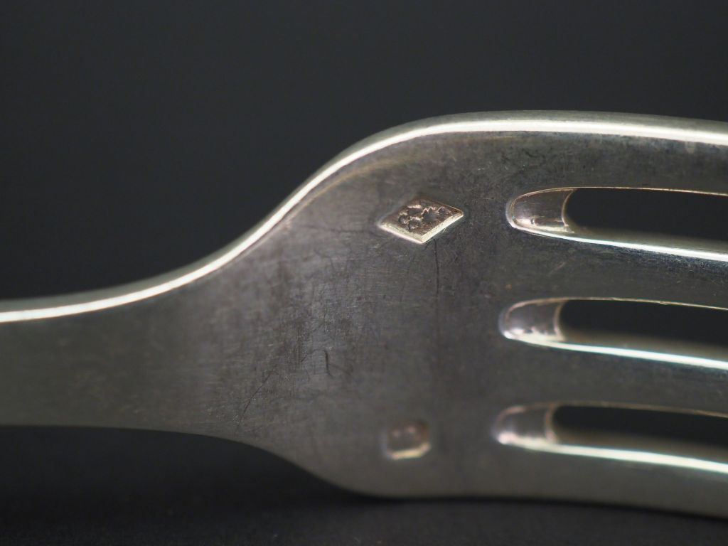 Suite de dix grandes fourchettes de style Art déco en argent, poinçon Minerve. Le revers de la spatule godronné. Monogrammées. M.O : A.C ou A.G Poids. 902 g
