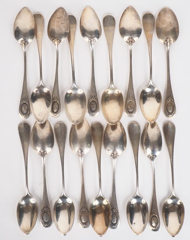 Suite de dix-huit petites cuillères de style Louis XVI en argent, poinçon Minerve, à décor de cartouche monogrammé et fleurons. Poids. 427 g