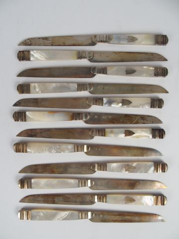 Suite de douze couteaux à fruit, lame en argent poinçon Minerve, manche en nacre. MO : BL