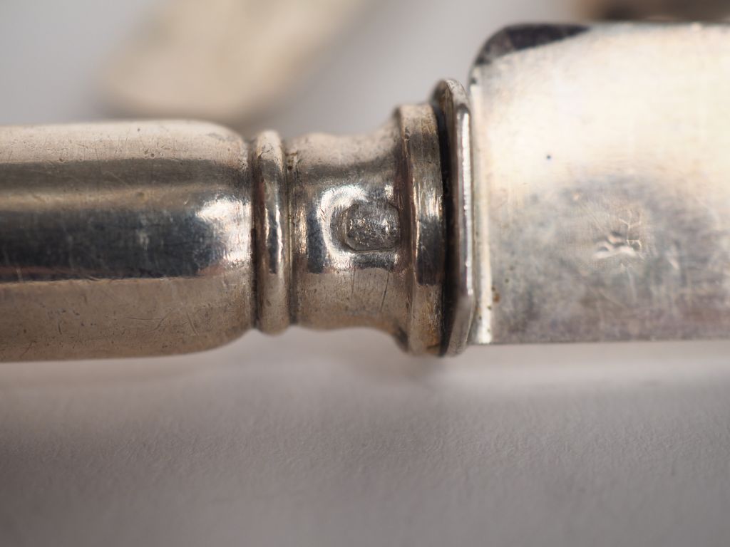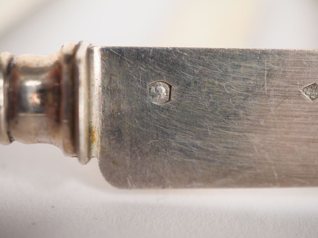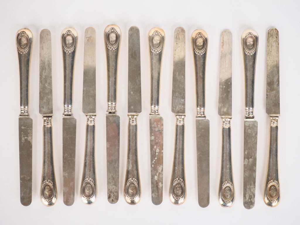 Suite de douze couteaux à fruits de style Louis XVI, lame argent poinçon Minerve. Manche argent fourré, à décor de cartouche monogrammé. Poids tel. 510 g