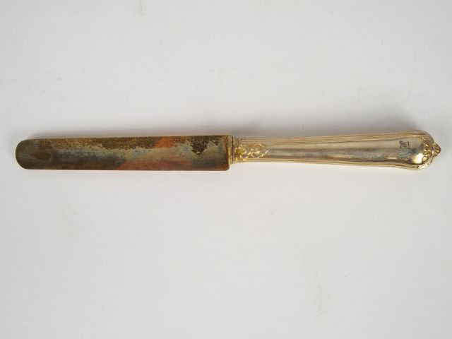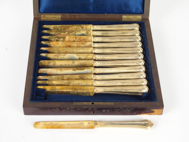 Suite de douze couteaux à fruits, lames en vermeil , manche argent fourré, monogrammés. Dans leur coffret XIXeme. Poids tel : 489 g
