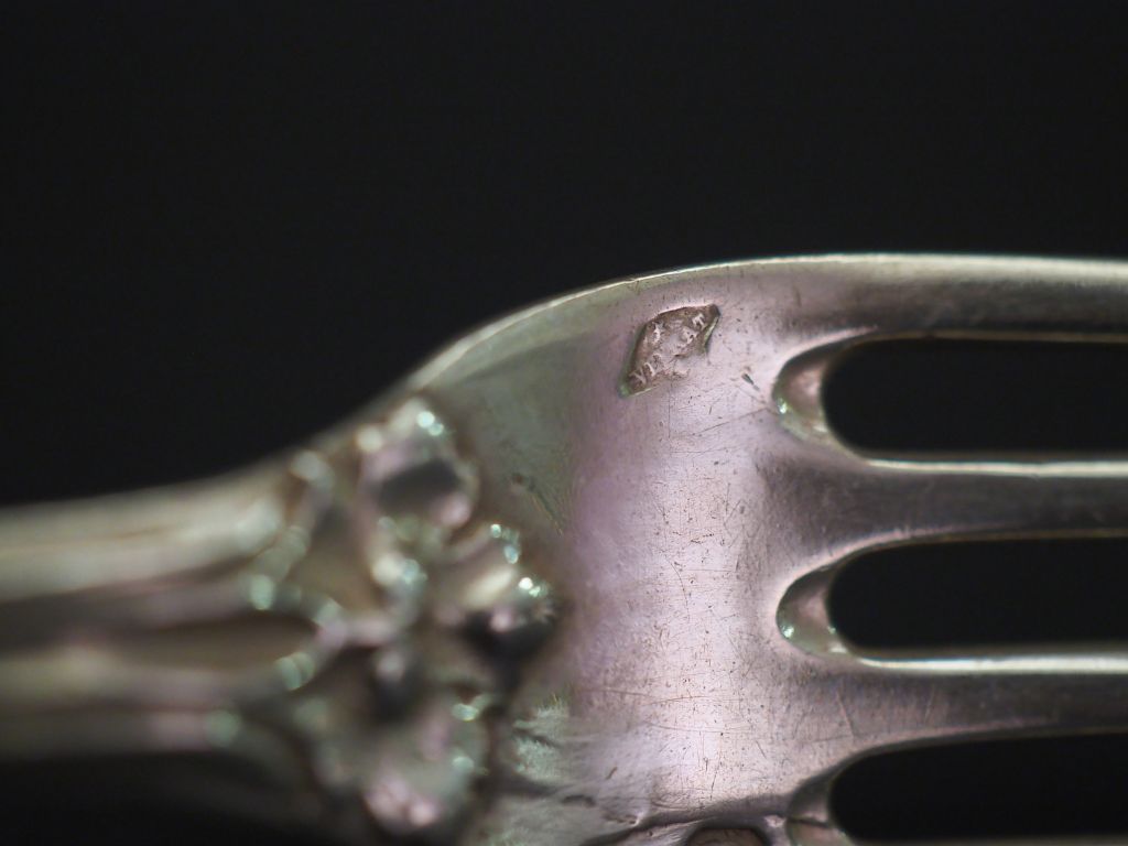 Suite de quatre couverts à entremets en argent, poinçon Minerve, à décor de masques, de fleuron et de coquilles. M.O : Veyrat On y joint quatre deux couverts à entremets en argent, poinçon Minerve, modèle légèrement dépareillé. M.O : P.Q Monogrammés. Poids. 609 g