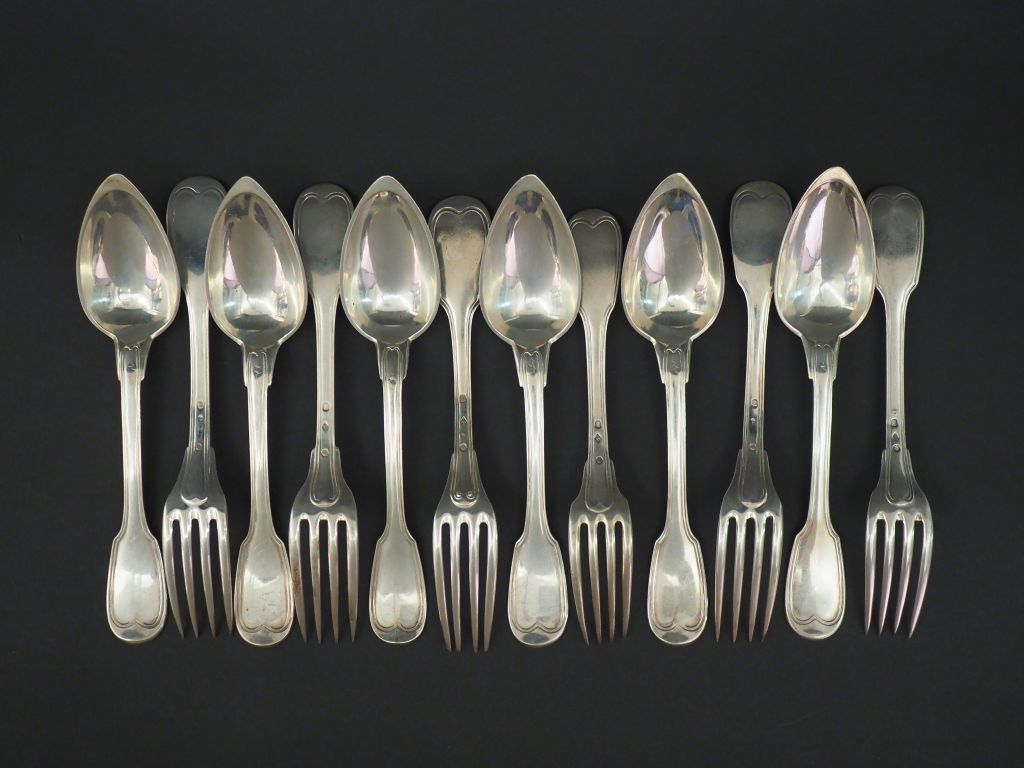 Suite de six grands couverts Restauration en argent, poinçon Vieillard, modèle à filet. M.O : J.O Poids. 1072 g (maitres orfèvres différents pour deux fourchettes)