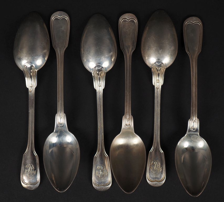 Suite de six petites cuillères en argent 925, poinçon Minerve, modèle à filets. Monogrammées. Long. 14,5 cm Poids. 150 g