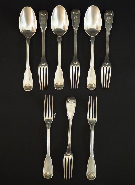 Suite de trois couverts et trois fourchettes à entremets en argent, poinçon Minerve, modèle à double coquilles. Monogrammés. Poids. 482 g