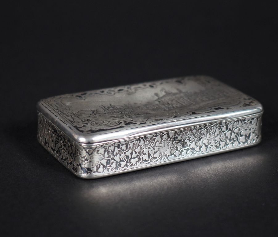 Tabatière en argent, poinçon Minerve (objet autrefois niellé), à décor sur le couvercle d'une ville de bord de mer. Poids : 85 g (mauvais état)