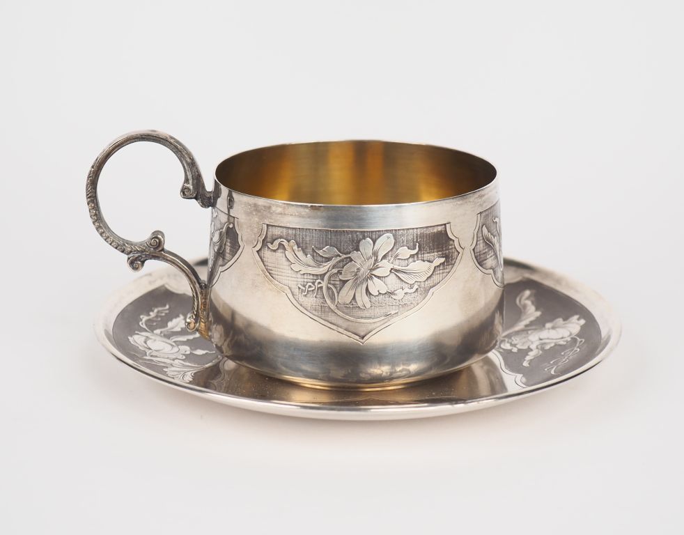 Tasse et sa sous-tasse en argent, poinçon Minerve, à décor de fleurs dans des réserves. M.O : P.D H. 7,5 cm Poids. 297 g