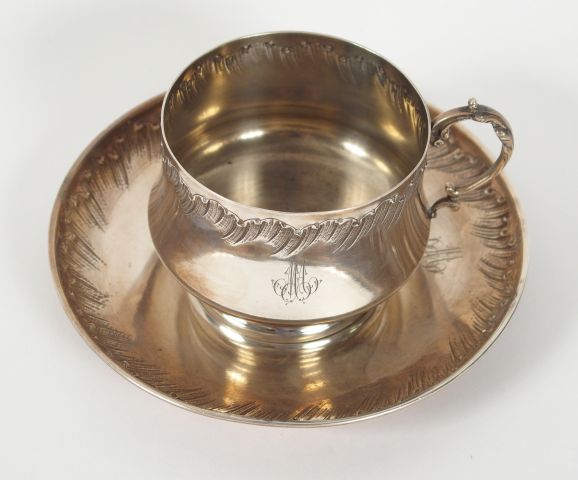 Tasse et sa sous-tasse Napoléon III de style rocaille en argent, poinçon Minerve. Monogrammée. Poids. : 283 gr