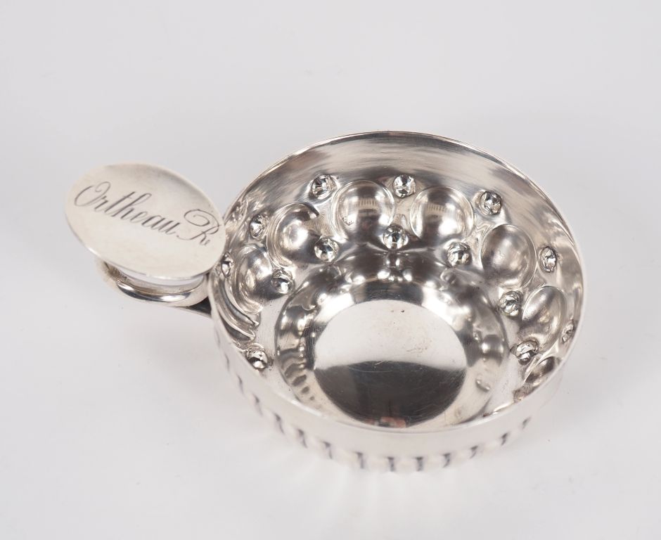 Taste-vin en argent 925, poinçon Minerve, à décor de côtes torses et pastilles. Gravé sur l'anse. Diam. 7,3 cm Long. 10,3 cm Poids. 82 g