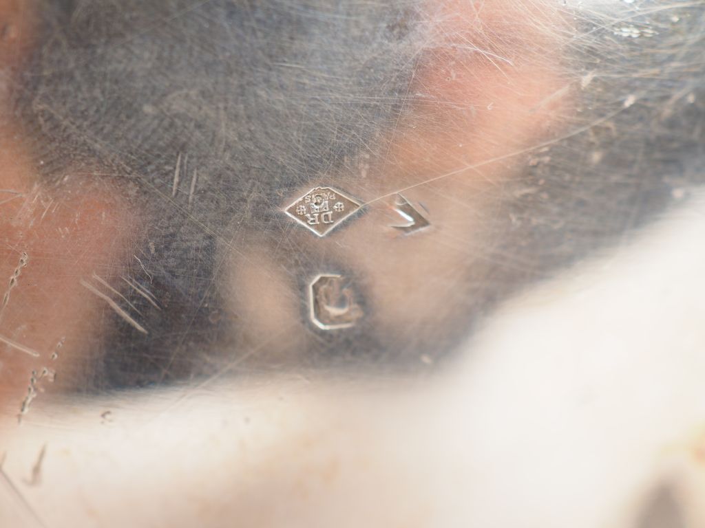 Théière de style rocaille en argent, poinçon Minerve, à décor de monogramme dans un cartouche feuillagé, de feuillage. Prise en forme de fleurs. H. 23 cm Poids. 567 g (légers accidents au pied)
