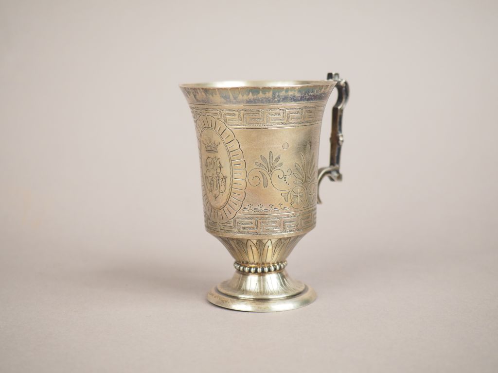 Timbale à anse en argent anglais, à décor de monogramme dans un cartouche, de feuillage et de frises de grecque. H. 10,4 cm Poids. 155 g (léger enfoncement)