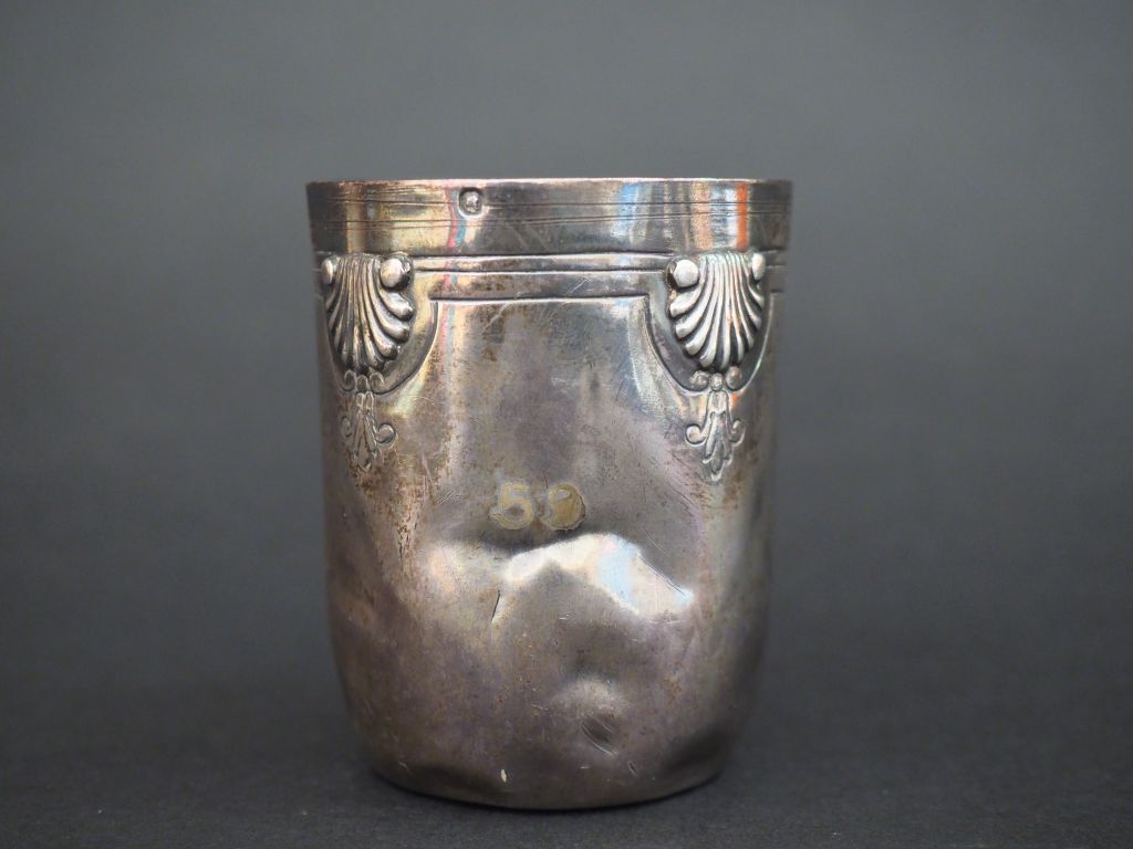 Timbale de style Louis XV en argent, poinçon Minerve, à décor de coquilles et de fleurons. H. 7,5 cm Poids. 80,73 g (enfoncements)