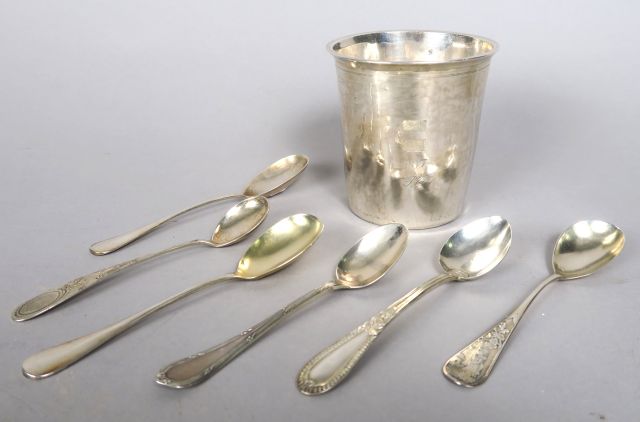 Timbale en argent, poinçon Minerve, on y joint 6 différentes petites cuillères en argent, poinçon Minerve. Poids : 134 g