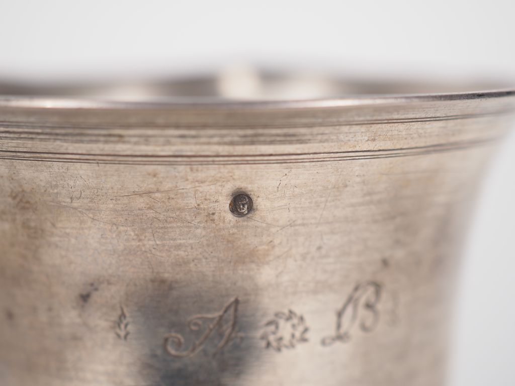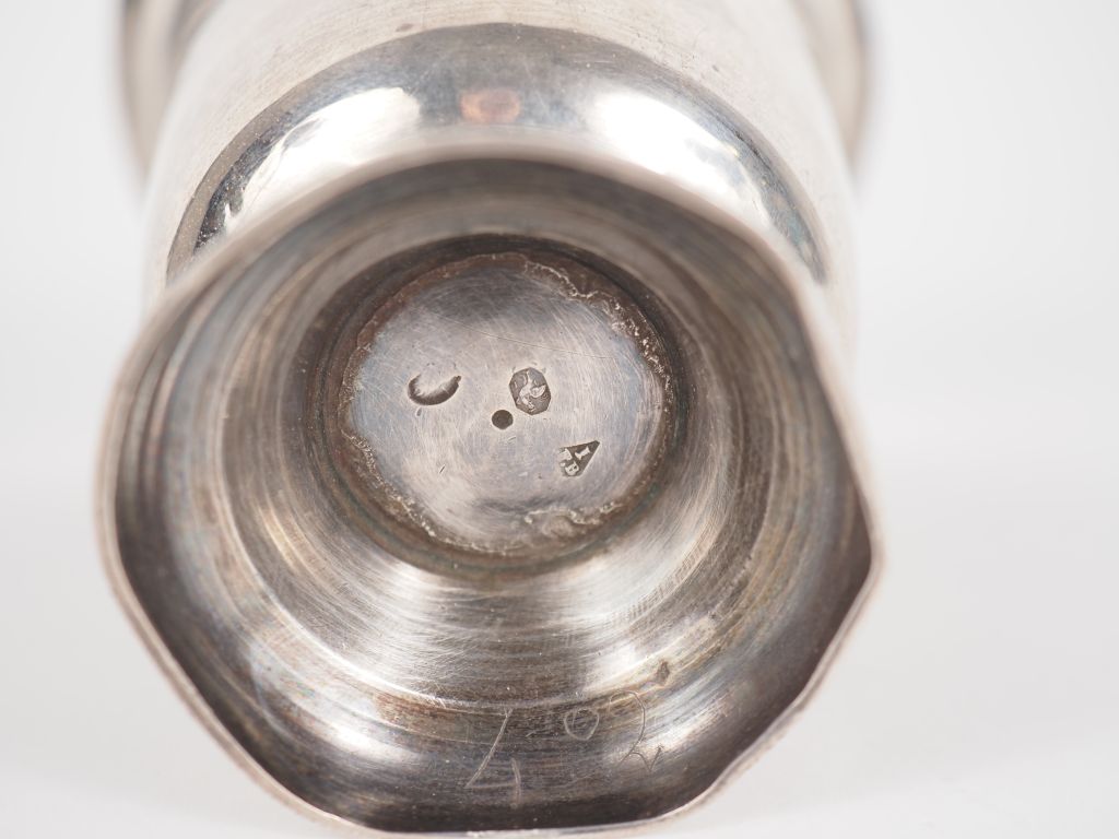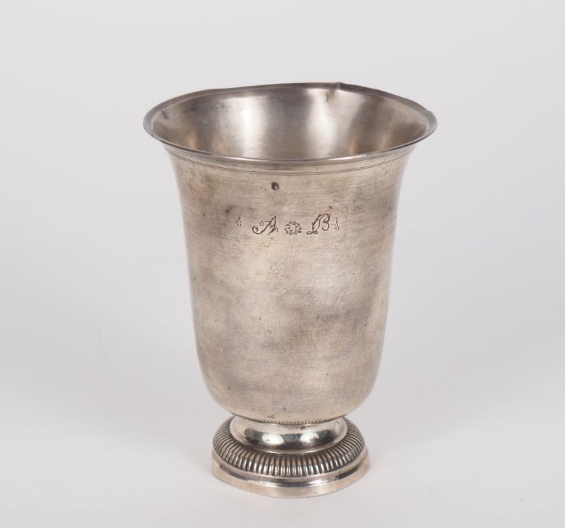 Timbale fin XVIIIème - début XIXème en argent 950, poinçon au 1er Coq. Le piédouche agrémenté d'une frise de godrons. Gravée. H. 11,6 cm Poids. 125 g