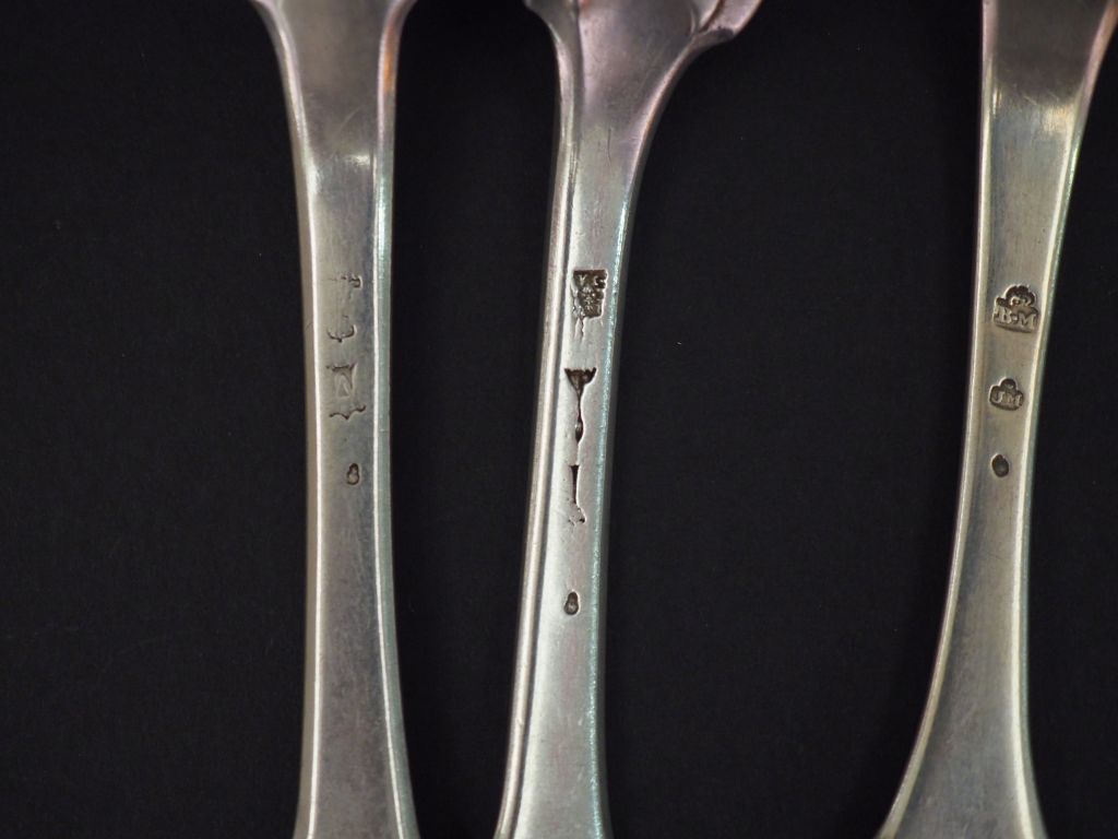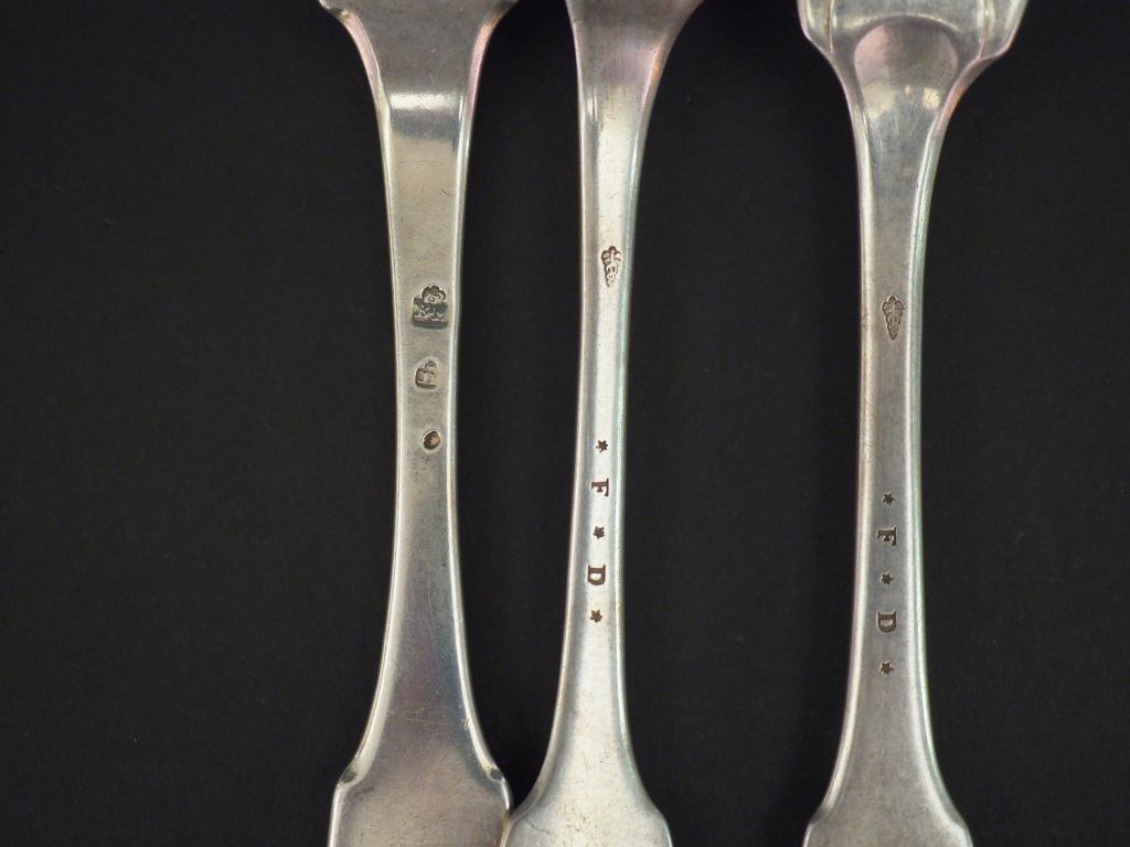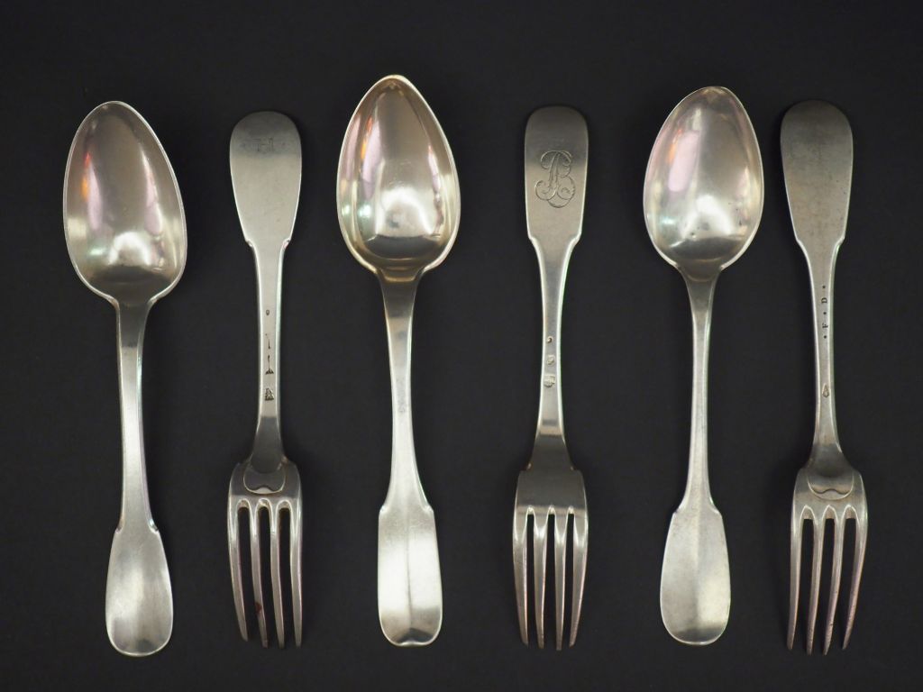 Trois différentes couverts en argent, XVIIIème, modèle uniplat. Monogrammés. Poids. 486 g