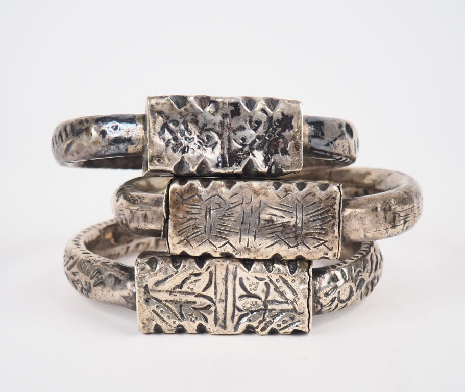 Trois différents bracelets d'esclave Afrique du Nord en argent bas titre. Poids. 227 g