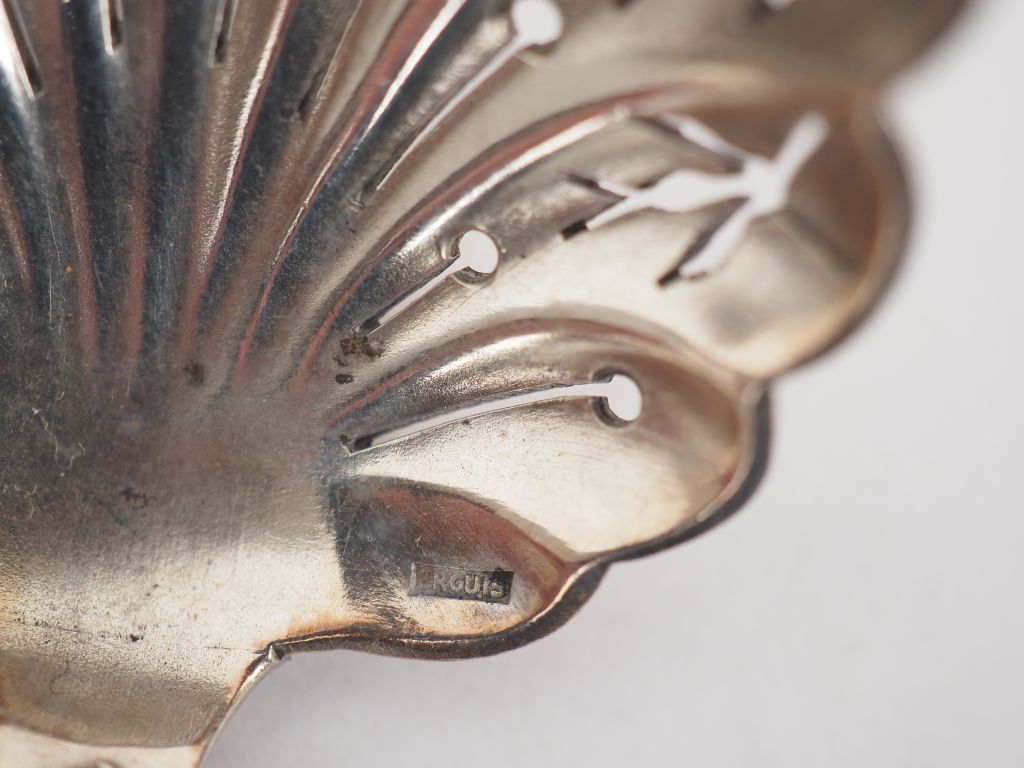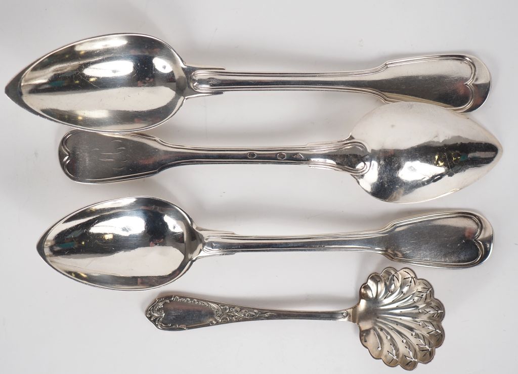 Trois grandes cuillères en argent, poinçons et modèles dépareillés. Monogrammées. Poids. 217 g On y joint une petite cuillère à saupoudrer en métal argenté.