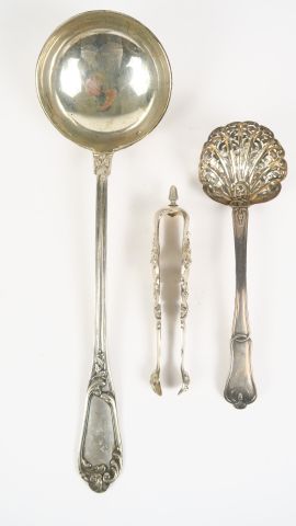Une louche, un saupoudroir, une pince à sucre en argent, poinçon Minerve. 312 g