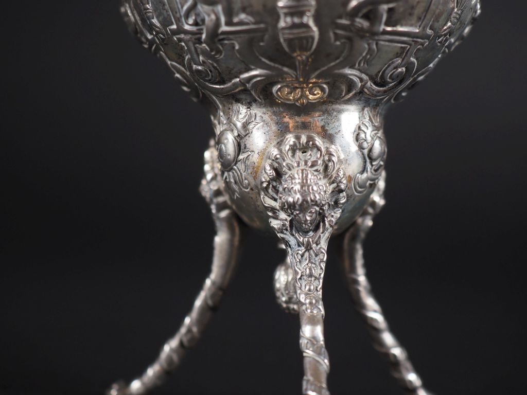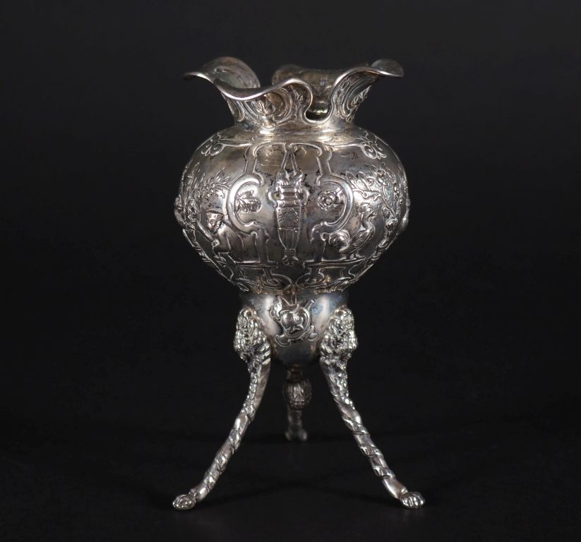 Vase sur pied griffe, décor de singes, sphinges et volatiles et tête de femme, col à quatre pétales et feuille. Argent étranger Poids : 150 g