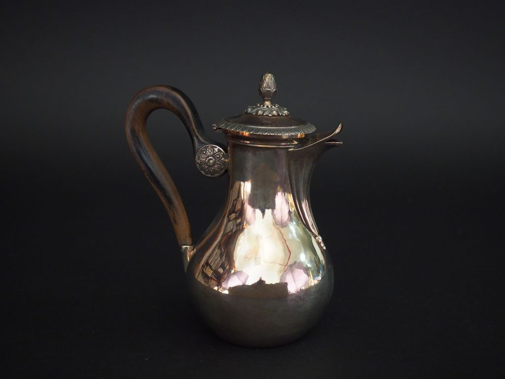 Verseuse à fond plat en argent, poinçon Vieillard. Bec verseur cannelé, couvercle à décor de frise de feuilles d'eau et prise en forme de pigne. Manche anciennement en bois noirci. H. 15,5 cm Poids tel. 208 g (usures au manche)