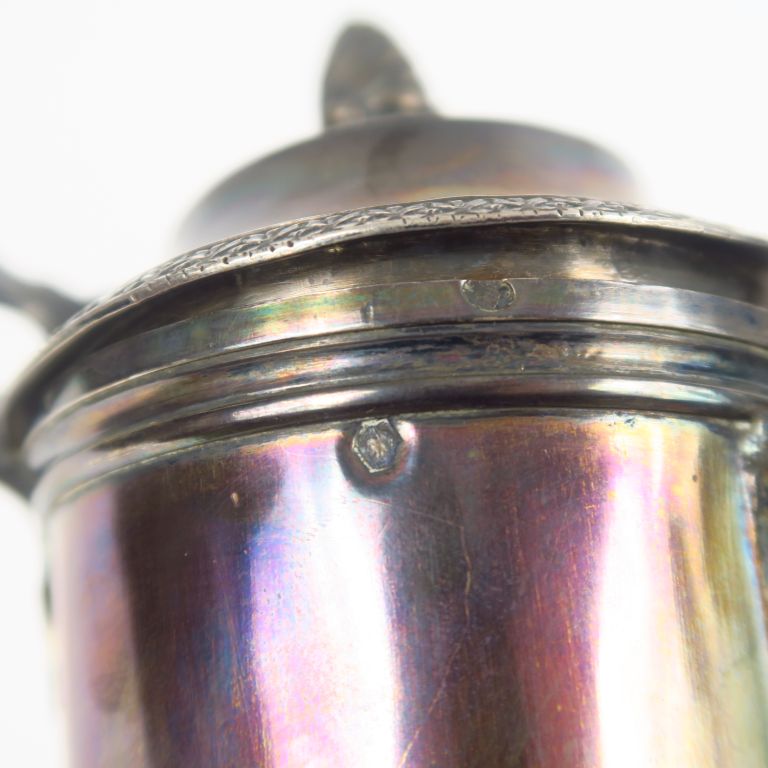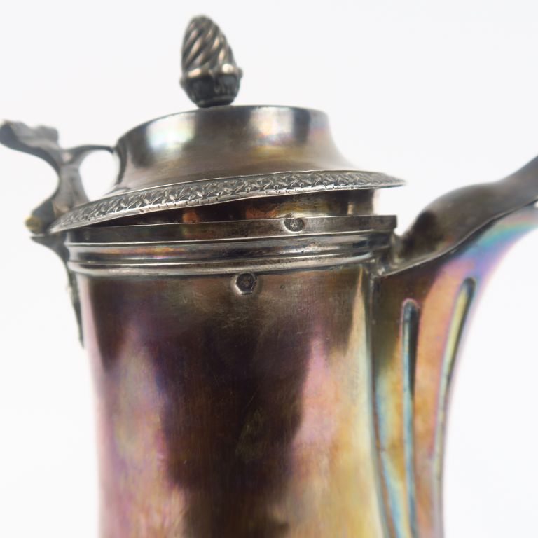 Verseuse en argent, poinçon Vieillard, à décor de palmettes, reposant sur trois pieds griffe. Manche en bois. Poids (sans le manche). 725 g