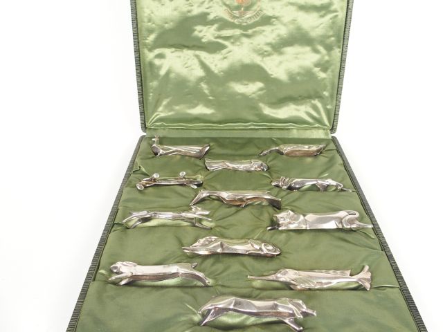 Lot de Christofle, GALLIA. 12 porte couteaux en métal argenté en forme d'anim au prix de 300 à 500 € en vente aux enchères par l'hôtel des ventes Primardeco