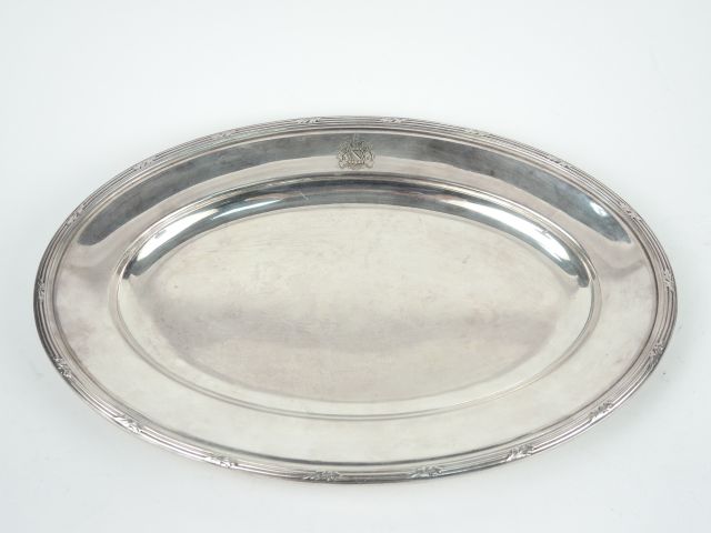 CHRISTOFLE. Grand plat ovale de style Louis XVI en métal argenté. Gravé de belles armoiries