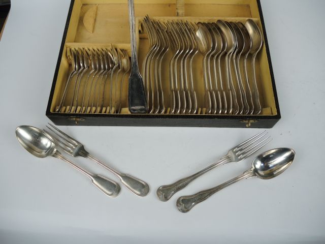 Deux parties de ménagère en métal argenté, 6 couverts et 6 petites cuillères, modèle à filet, et 6 couverts et 6 petites cuillères modèle à filet, spatule de forme violonnée . On y joint une louche