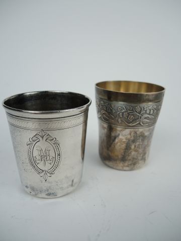 Deux timbales en argent, l'une à décor gravé d'une frise de muguet, l'autre gravée dans un monogramme dans un cartouche.(cabossée) Poids : 148 g
