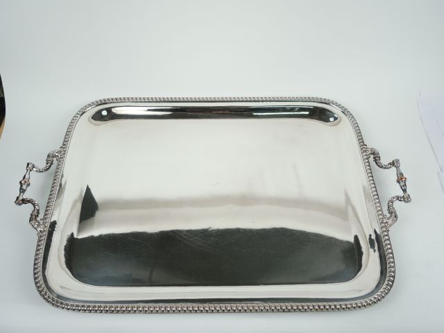 Grand plateau en métal argenté, à décor de frise de godrons, anses à décor feuillagé.