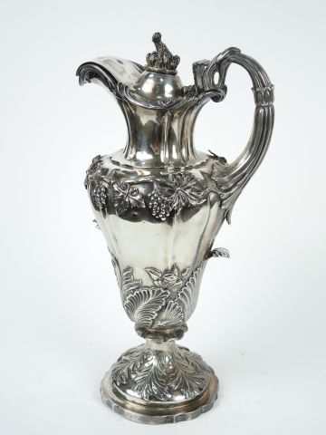 Grande verseuse en argent anglais, à décor de pampres, de feuillages et de fleurs, prise en forme d'oiseau (à refixer). Poids : 1240g