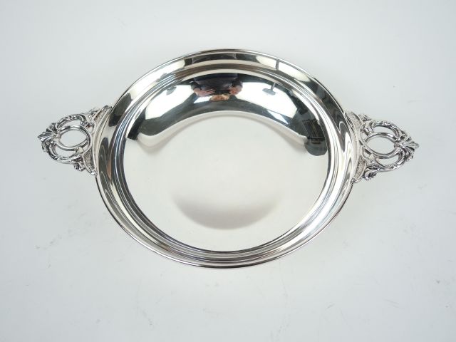 Plat creux à anses en métal argenté, anses ajourées et feuillagées.