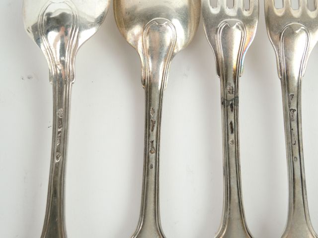 Quatre cuillères et deux fourchettes en argent XVIIIe, poinçons dépareillés. Poids : 527g